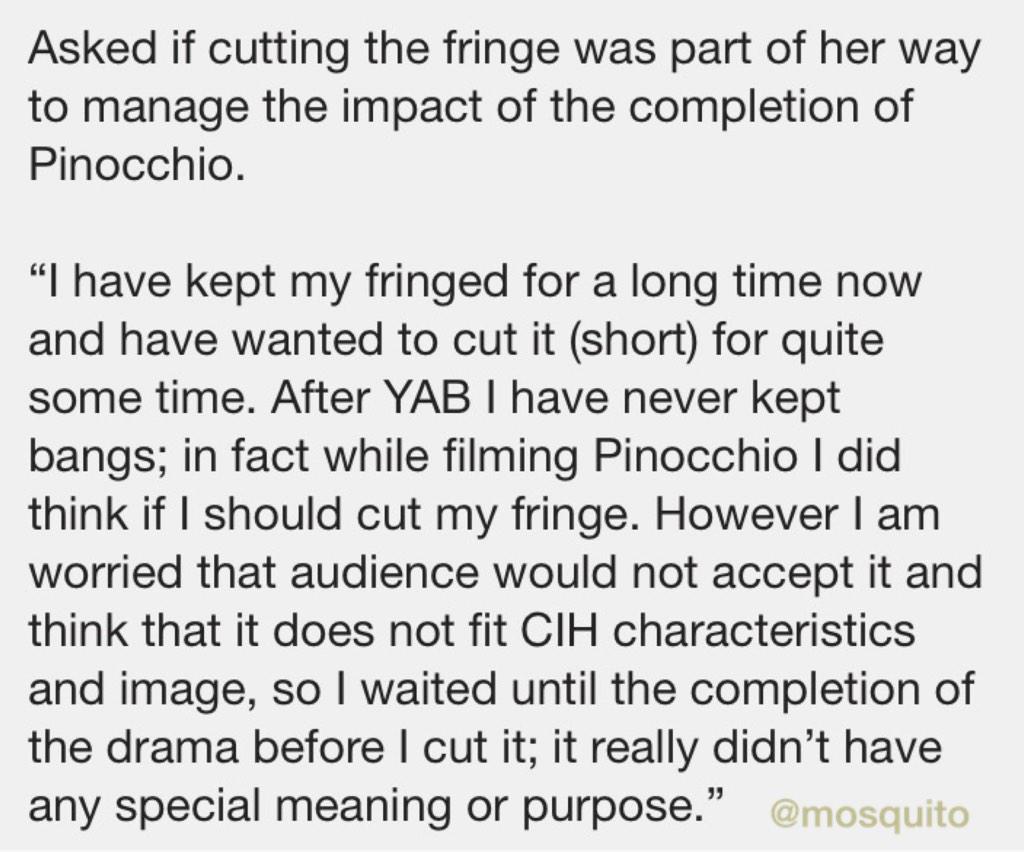 “People think that I can only portray characters who act happy in front of others and hide their pain in the inside.” and “It was refreshing for me to act the scene in episode 10 in <Pinocchio> where I as Choi Inha was able to say what was Dalpo said to her about people with Pinocchio syndrome to her mom.”